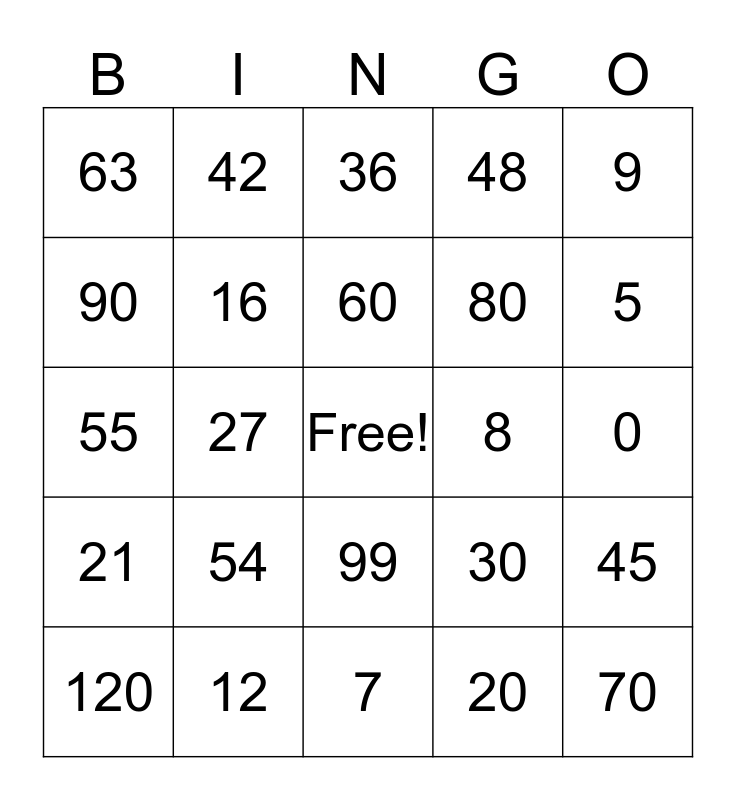 This bingo card has a free space and 24 words: 54, 12, 60, 120, 9, 63, 90, 42, 8, 99, 80, 55, 30, 45, 16, 20, 0, 36, 5, 27, 70, 21, 48 and 7.