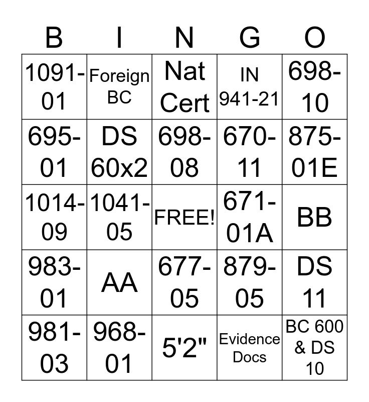 This bingo card has a free space and 24 words: AA, 968-01, 698-08, 981-03, 698-10, 1091-01, 695-01, Foreign BC, 671-01A, 677-05, 670-11, 1014-09, 879-05, DS 11, DS 60x2, Evidence Docs, BB, Nat Cert, 875-01E, 1041-05, BC 600 & DS 10, 983-01, IN 941-21 and 5'2".