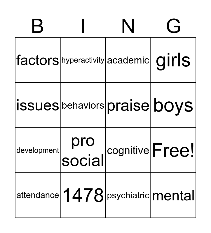 This bingo card has 20 words: Free!, childminder, academic, nursery, attendance, issues, 1478, factors, development, hyperactivity, pro social, cognitive, behaviors, mental, praise, girls, boys, girls, psychiatric and may.