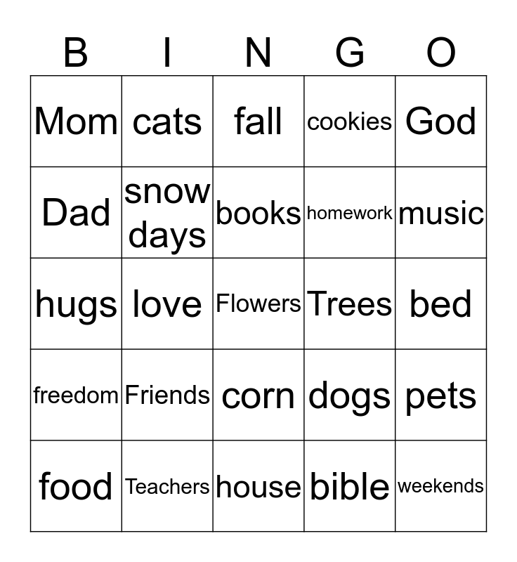 This bingo card has a free space and 24 words: Friends, Teachers, books, food, God, Mom, Dad, cats, Trees, corn, homework, hugs, dogs, pets, snow days, bible, bed, fall, music, love, weekends, freedom, cookies and house.