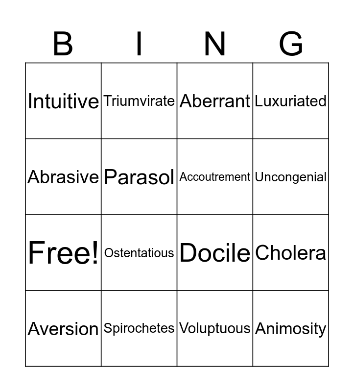 This bingo card has 16 words: Aversion, Spirochetes, Aberrant, Luxuriated, Abrasive, Triumvirate, Docile, Cholera, Intuitive, Parasol, Voluptuous, Uncongenial, Free!, Ostentatious, Accoutrement and Animosity.