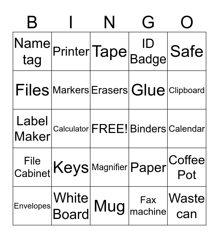 This bingo card has a free space and 27 words: Paper, Pens, Glue, Mug, Files, Tape, Printer, File Cabinet, Binders, Coffee Pot, Label Maker, ID Badge, Envelopes, White Board, Clipboard, Scissors, Markers, Erasers, Keys, Name tag, Calendar, Fax machine, Calculator, Waste can, Magnifier, Safe and Ruler.