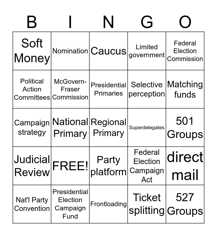 This bingo card has 25 words: FREE!, Frontloading, Presidential Primaries, Nat'l Party Convention, Federal Election Commission, Soft Money, Political Action Committees, Nomination, Superdelegates, Party platform, Selective perception, Campaign strategy, Federal Election Campaign Act, direct mail, McGovern-Fraser Commission, 527 Groups, 501 Groups, Caucus, Matching funds, National Primary, Regional Primary, Presidential Election Campaign Fund, Judicial Review, Limited government and Ticket splitting.