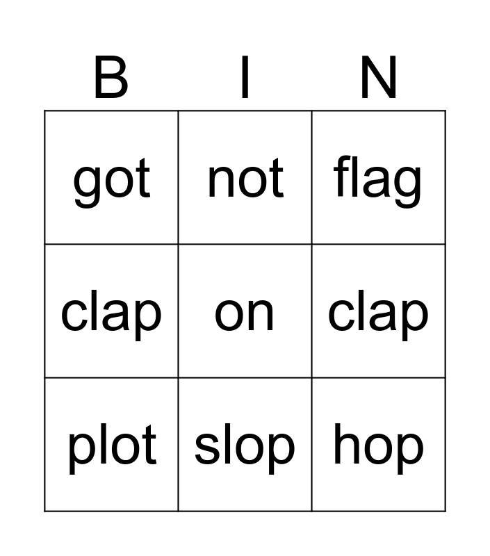 This bingo card has 10 words: slop, flag, got, on, clap, plot, not, fox, clap and hop.