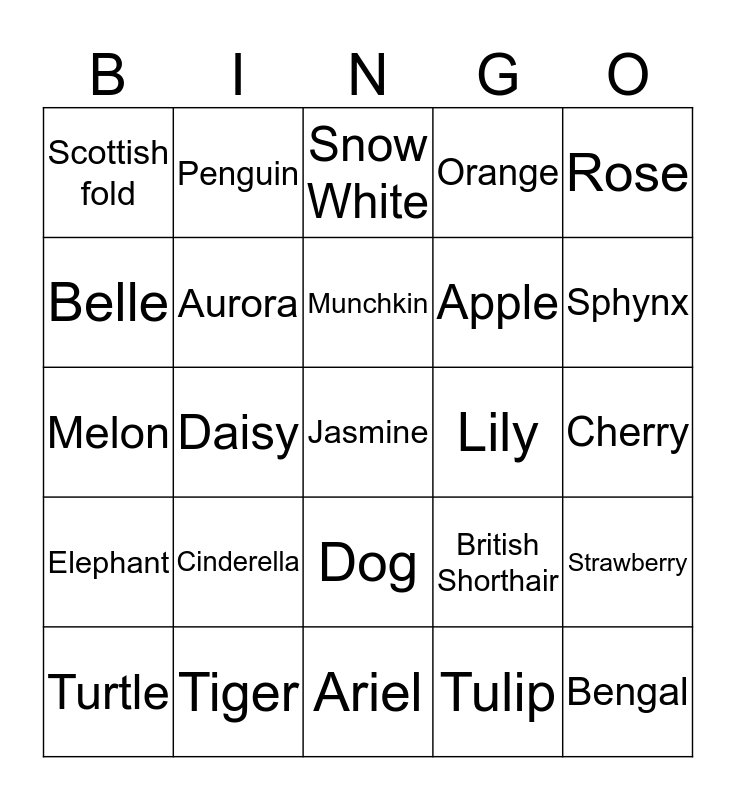 This bingo card has a free space and 24 words: Cinderella, Tiger, Munchkin, Turtle, Rose, Scottish fold, Belle, Penguin, Lily, Dog, Apple, Melon, British Shorthair, Strawberry, Aurora, Tulip, Cherry, Snow White, Sphynx, Daisy, Bengal, Elephant, Orange and Ariel.