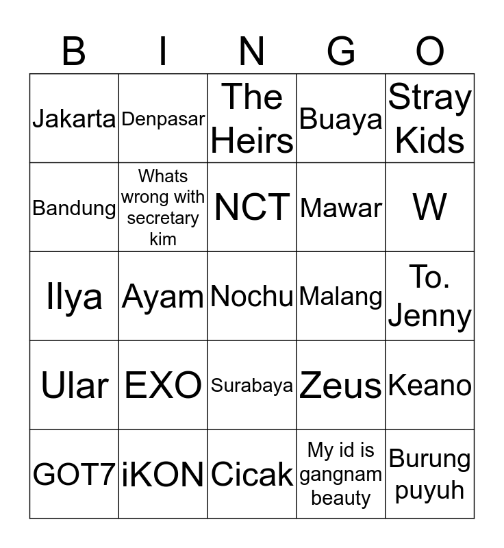 This bingo card has a free space and 24 words: EXO, iKON, NCT, GOT7, Stray Kids, Jakarta, Bandung, Denpasar, Malang, Surabaya, Mawar, Ilya, Zeus, Keano, Whats wrong with secretary kim, My id is gangnam beauty, To. Jenny, The Heirs, W, Ayam, Burung puyuh, Ular, Buaya and Cicak.