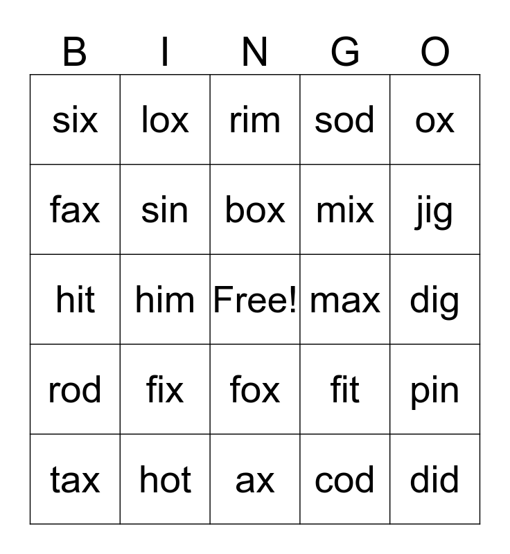 This bingo card has a free space and 25 words: fix, ax, box, tax, ox, six, fax, lox, max, fox, mix, hit, fit, pin, sin, hid, dig, rim, jig, him, did, hot, rod, sod and cod.
