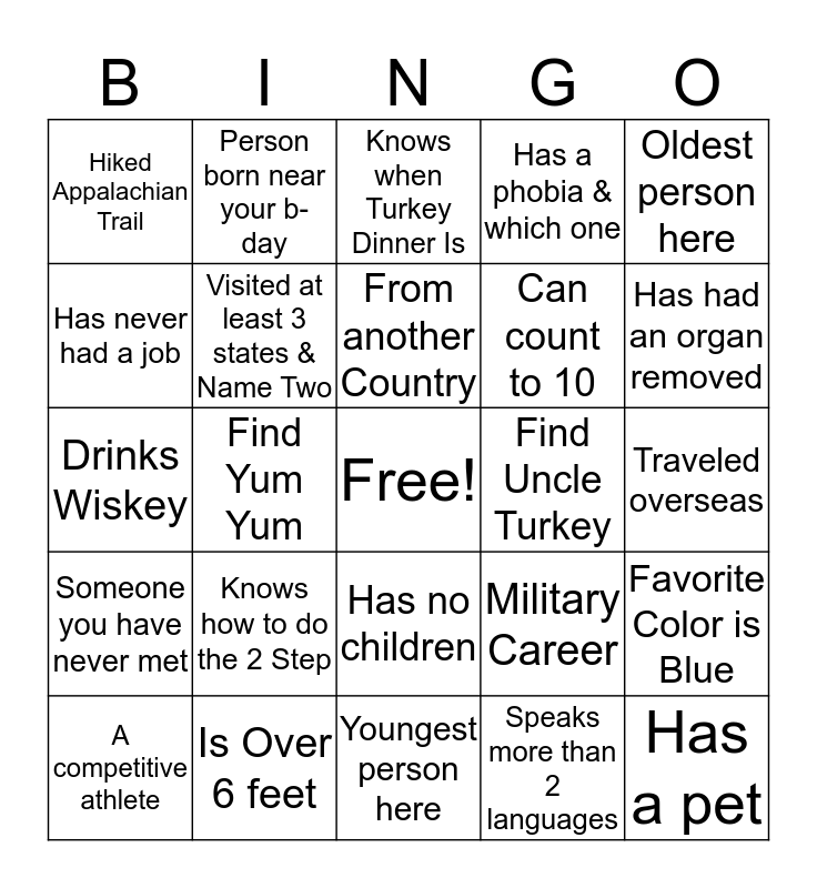 This bingo card has a free space and 24 words: A competitive athlete, Knows how to do the 2 Step, From another Country, Speaks more than 2 languages, Oldest person here, Hiked Appalachian Trail, Person born near your b-day, Knows when Turkey Dinner Is, Find Uncle Turkey, Traveled overseas, Drinks Wiskey, Visited at least 3 states & Name Two, Military Career, Favorite Color is Blue, Has never had a job, Is Over 6 feet, Youngest person here, Has a phobia & which one, Has had an organ removed, Someone you have never met, Find Yum Yum, Has no children, Can count to 10 and Has a pet.