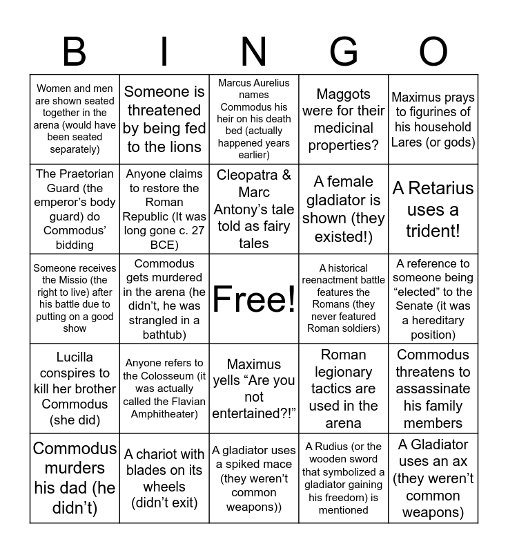 This bingo card has a free space and 29 words: Commodus murders his dad (he didn’t), Commodus inappropriately lusts have his sister (he may have), Commodus gets murdered in the arena (he didn’t, he was strangled in a bathtub), Marcus Aurelius Outlaws Gladiator Games in Rome (he condoned and hosted them), Women and men are shown seated together in the arena (would have been seated separately), Marcus Aurelius names Commodus his heir on his death bed (actually happened years earlier), Anyone claims to restore the Roman Republic (It was long gone c. 27 BCE), Anyone refers to the Colosseum (it was actually called the Flavian Amphitheater), A historical reenactment battle features the Romans (they never featured Roman soldiers), A chariot with blades on its wheels (didn’t exit), A reference to someone being “elected” to the Senate (it was a hereditary position), A Gladiator uses an ax (they weren’t common weapons), A gladiator uses a spiked mace (they weren’t common weapons)), A Rudius (or the wooden sword that symbolized a gladiator gaining his freedom) is mentioned, A Retarius uses a trident!, Animals appear out of a trap doors!, Maximus yells “Are you not entertained?!”, Lucilla conspires to kill her brother Commodus (she did), Maximus prays to figurines of his household Lares (or gods), Someone receives the Missio (the right to live) after his battle due to putting on a good show, Roman legionary tactics are used in the arena, A rich woman lusts after a gladiator (happened a lot), A female gladiator is shown (they existed!), The Praetorian Guard (the emperor’s body guard) do Commodus’ bidding, Maggots were for their medicinal properties?, Someone is threatened by being fed to the lions, Commodus threatens to assassinate his family members, Cleopatra & Marc Antony’s tale told as fairy tales and Gladiators train with wooden weapons.