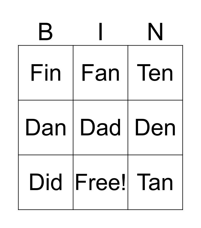 This bingo card has a free space and 8 words: Den, Ten, Fan, Did, Fin, Tan, Dan and Free!.