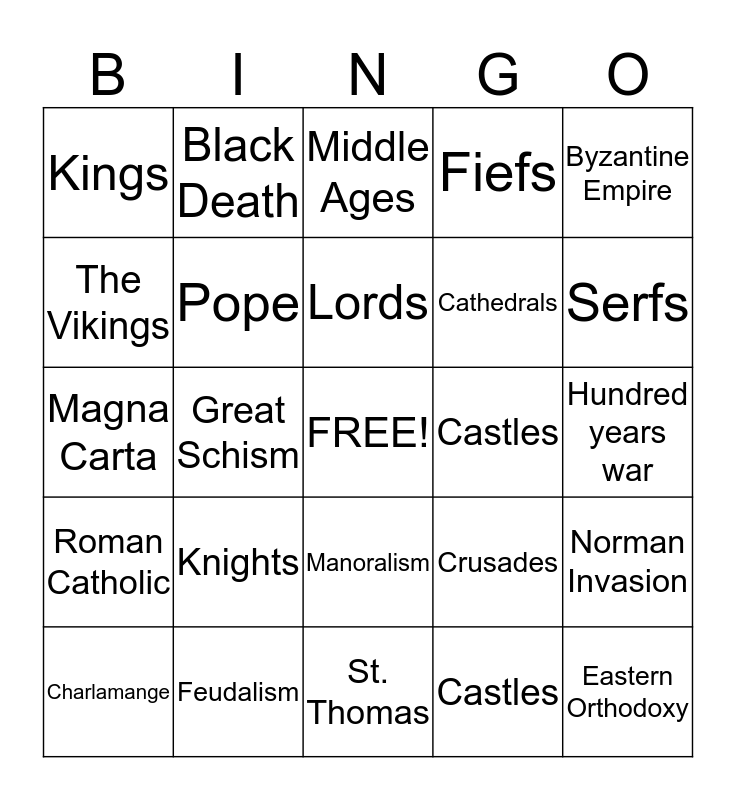 This bingo card has a free space and 24 words: Knights, Feudalism, Lords, Charlamange, Byzantine Empire, Kings, The Vikings, Black Death, Castles, Manoralism, Cathedrals, Magna Carta, Crusades, Norman Invasion, Pope, Castles, Hundred years war, Middle Ages, Serfs, Great Schism, Eastern Orthodoxy, Roman Catholic, Fiefs and St. Thomas.