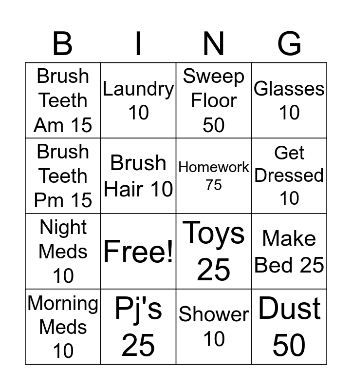 This bingo card has 16 words: Pj's 25, Make Bed 25, Sweep Floor 50, Brush Teeth Am 15, Night Meds 10, Laundry 10, Toys 25, Shower 10, Brush Teeth Pm 15, Brush Hair 10, Morning Meds 10, Glasses 10, Free!, Get Dressed 10, Homework 75 and Dust 50.