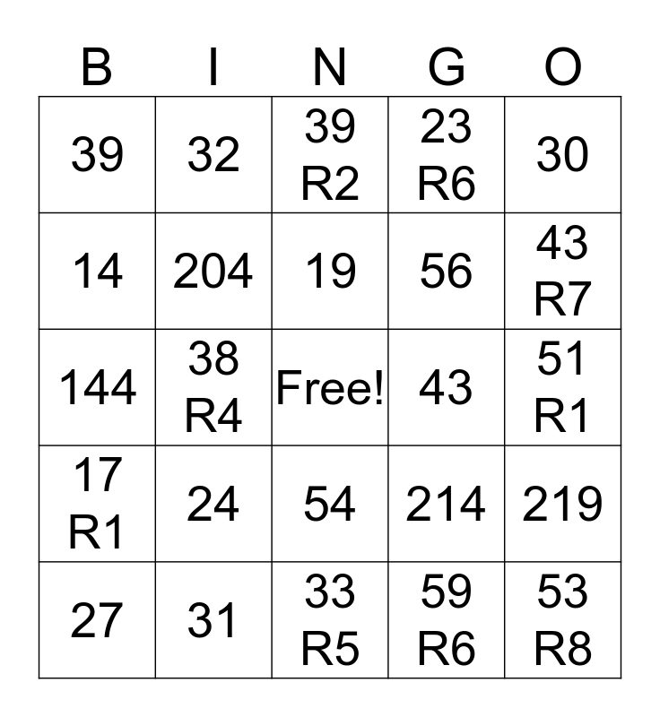 This bingo card has a free space and 24 words: 24, 31, 19, 27, 30, 39, 14, 32, 43, 54, 56, 144, 214, 219, 204, 59 R6, 51 R1, 39 R2, 43 R7, 38 R4, 53 R8, 17 R1, 23 R6 and 33 R5.
