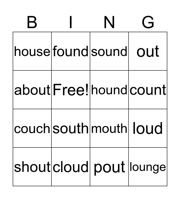 This bingo card has 20 words: loud, mouse, sound, blouse, shout, about, cloud, house, couch, found, south, mouth, Free!, lounge, hound, pounce, count, out, pout and pound.