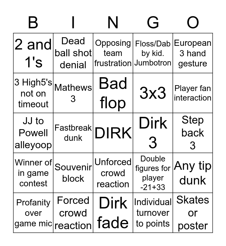 This bingo card has a free space and 41 words: Alleyoop to DeAndre, JJ to Powell alleyoop, Opposing team airball, Mathews 3, Forced crowd reaction, Unforced crowd reaction, Bad flop, Dunk by non American, European 3 hand gesture, Winner of in game contest, Fastbreak dunk, Floss/Dab by kid. Jumbotron, Skates or poster, Step back 3, Dirk 3, Souvenir block, 3 robberies, 2 and 1's, Heat check, Opposing team frustration, Any tip dunk, Former MAVS touches court, Dirk fade, 3x3, Any lost shoe, Opposing team disqualify, Individual turnover to points, Sick MAVS assist, Player fan interaction, (not) fight, Boy band song plays, Dead ball shot denial, Profanity over game mic, Cuban upset, Double figures for player -21+33, 3 High5's not on timeout, "Flex" move after nice play, chasedown block or legit fingerroll, DeAndre makes 2 ft, Thrown back in blender and anything Shaqtin.