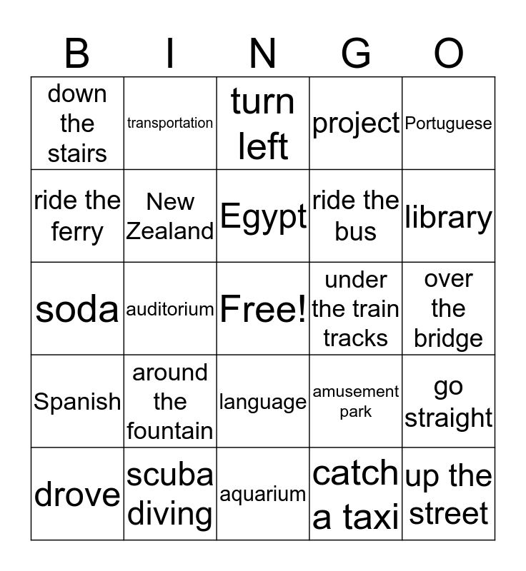 This bingo card has a free space and 40 words: sandals, soda, research, New Zealand, scuba diving, language, Egypt, Arabic, Portuguese, Spanish, auditorium, project, up the street, over the bridge, under the train tracks, around the fountain, along the river, down the stairs, turn right, turn left, go straight, catch a taxi, ride the bus, ride the ferry, take the train, take the train, take the subway, drive a car, caught, rode, took, drove, museum, amusement park, library, aquarium, department store, zoo, transportation and directions.
