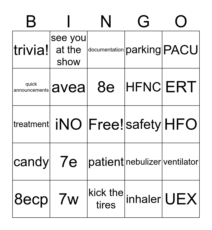 This bingo card has a free space and 24 words: 7e, 7w, 8e, 8ecp, PACU, trivia!, quick announcements, see you at the show, safety, patient, HFNC, treatment, nebulizer, ventilator, avea, inhaler, HFO, documentation, ERT, iNO, UEX, candy, parking and kick the tires.
