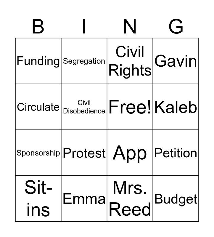 This bingo card has 19 words: App, Money, Civil Rights, Budget, Petition, Circulate, Mrs. Reed, Funding, Segregation, Sponsorship, Protest, Civil Disobedience, Free!, Emma, Sit-ins, Signatures, Gavin, Kaleb and Aubree.