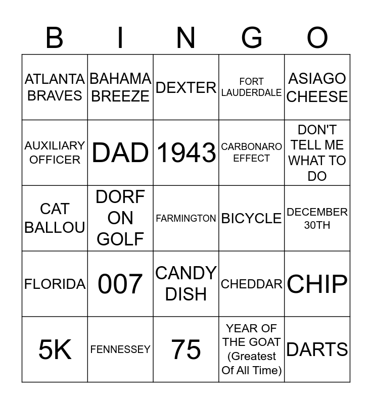 This bingo card has 25 words: 007, 75, 1943, 5K, ASIAGO CHEESE, ATLANTA BRAVES, AUXILIARY OFFICER, BAHAMA BREEZE, BICYCLE, CANDY DISH, CARBONARO EFFECT, CAT BALLOU, CHEDDAR, CHIP, DAD, DARTS, DECEMBER 30TH, DEXTER, DON'T TELL ME WHAT TO DO, DORF ON GOLF, FARMINGTON, FENNESSEY, FLORIDA, FORT LAUDERDALE and YEAR OF THE GOAT (Greatest Of All Time).
