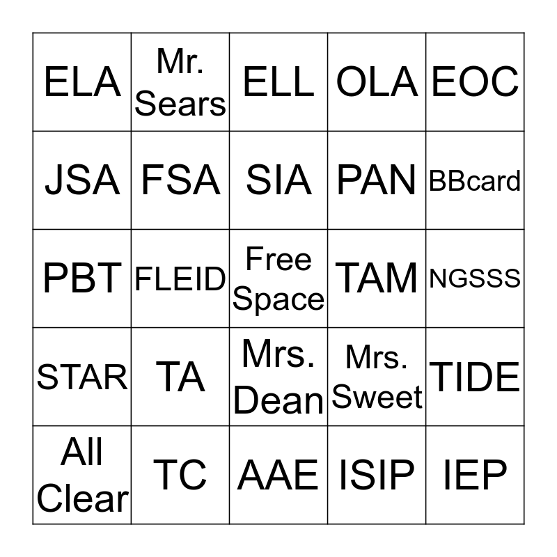 This bingo card has a free space and 25 words: TA, AAE, SIA, All Clear, EOC, ELA, JSA, Mr. Sears, TAM, Mrs. Dean, PAN, PBT, Mrs. Sweet, TIDE, FSA, CBT, NGSSS, ELL, BBcard, FLEID, IEP, TC, STAR, OLA and ISIP.