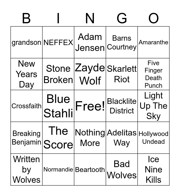 This bingo card has a free space and 24 words: The Score, Normandie, Zayde Wolf, Written by Wolves, Amaranthe, grandson, New Years Day, NEFFEX, Blacklite District, Nothing More, Skarlett Riot, Crossfaith, Adelitas Way, Hollywood Undead, Stone Broken, Bad Wolves, Light Up The Sky, Adam Jensen, Five Finger Death Punch, Blue Stahli, Ice Nine Kills, Breaking Benjamin, Barns Courtney and Beartooth.
