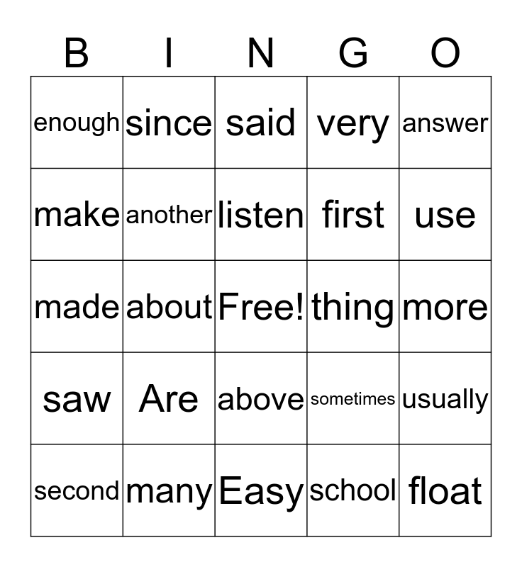 This bingo card has a free space and 25 words: Are, Easy, listen, second, answer, enough, make, since, thing, above, first, made, sometimes, usually, another, found, more, said, use, about, float, many, saw, very and school.