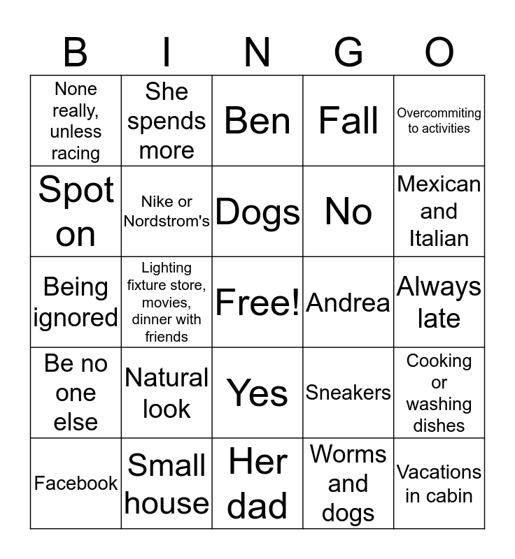 This bingo card has a free space and 24 words: Natural look, Small house, Dogs, Facebook, Overcommiting to activities, None really, unless racing, Spot on, She spends more, Andrea, Yes, No, Being ignored, Sneakers, Cooking or washing dishes, Nike or Nordstrom's, Worms and dogs, Always late, Ben, Mexican and Italian, Lighting fixture store, movies, dinner with friends, Vacations in cabin, Be no one else, Fall and Her dad.