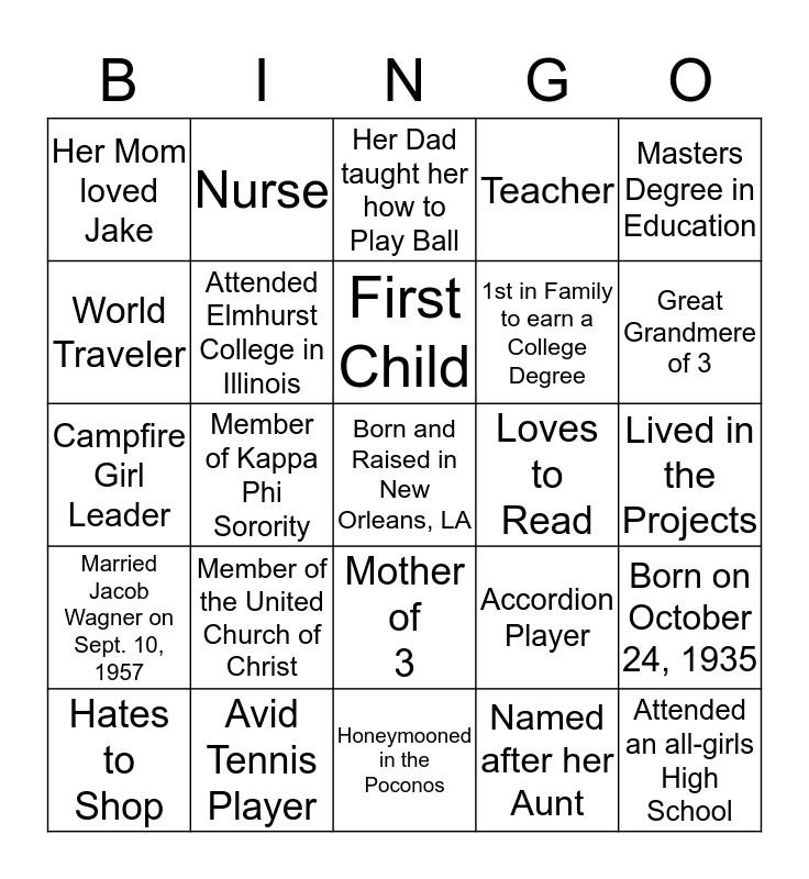 This bingo card has a free space and 29 words: Hates to Shop, Entered a Beauty Pageant, Member of Kappa Phi Sorority, Did not Learn to Drive until after she was Married, Her Mom loved Jake, Her Dad taught her how to Play Ball, Attended Elmhurst College in Illinois, Member of the United Church of Christ, Loves to Read, Avid Tennis Player, Lived in the Projects, Attended an all-girls High School, Honeymooned in the Poconos, Named after her Aunt, Great Grandmere of 3, Grandma of 7, Mother of 3, Married Jacob Wagner on Sept. 10, 1957, Masters Degree in Education, Campfire Girl Leader, Accordion Player, Hand Bell Ringer, 1st in Family to earn a College Degree, World Traveler, Teacher, Nurse, Born on October 24, 1935, First Child and Has 2 Sisters.
