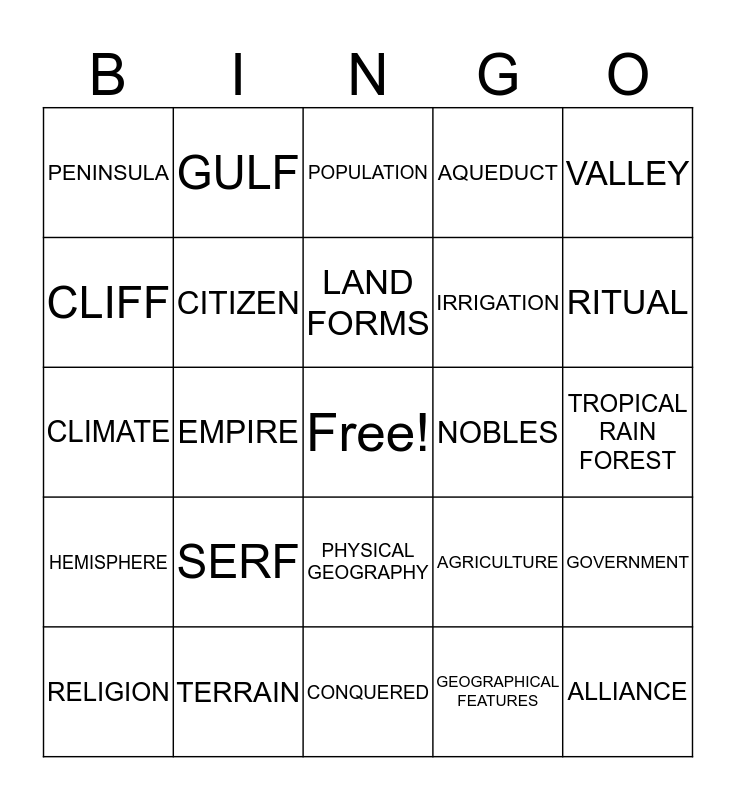 This bingo card has a free space and 26 words: PHYSICAL GEOGRAPHY, GEOGRAPHICAL FEATURES, LAND FORMS, TERRAIN, VALLEY, PENINSULA, CLIFF, GULF, TROPICAL RAIN FOREST, AGRICULTURE, IRRIGATION, CLIMATE, GOVERNMENT, RELIGION, EMPIRE, ALTITUDE, AQUEDUCT, HEMISPHERE, POPULATION, ALLIANCE, RITUAL, CONQUERED, NOBLES, SERF, CITIZEN and ENVIRONMENT.