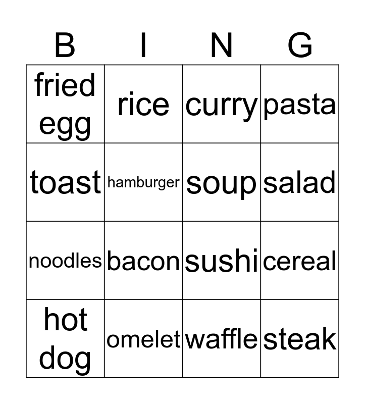 This bingo card has 16 words: omelet, cereal, curry, fried egg, noodles, rice, sushi, waffle, toast, hamburger, hot dog, pasta, bacon, salad, soup and steak.