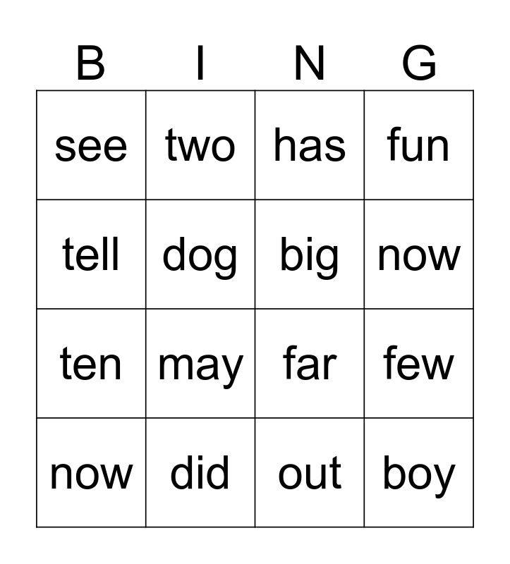 This bingo card has 28 words: got, say, ten, ask, dog, has, two, boy, did, way, far, fun, cat, yes, may, get, see, big, now, few, see, big, now, few, out, day, tell and why.