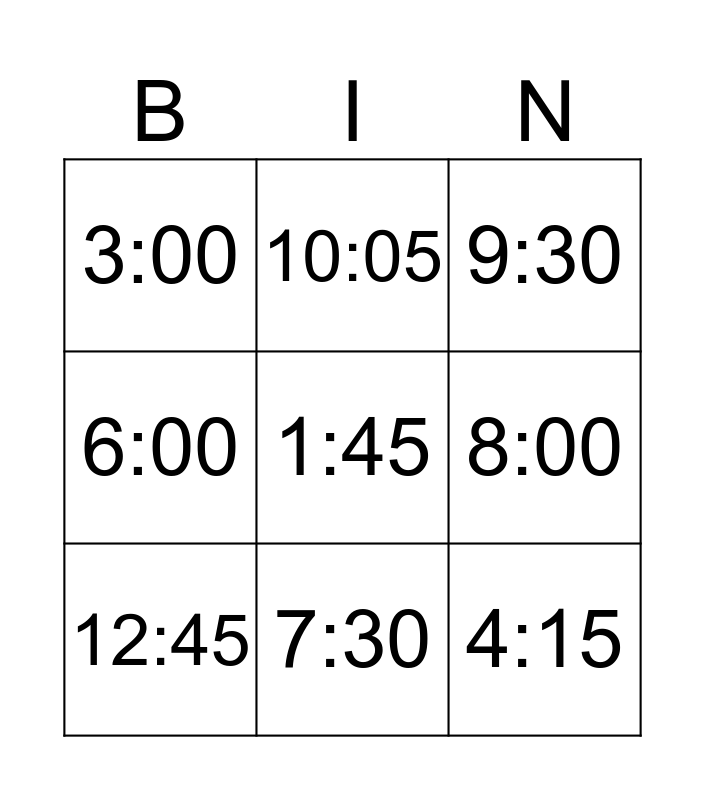 This bingo card has a free space and 8 words: 8:00, 9:30, 10:05, 12:45, 3:00, 4:15, 6:00 and 7:30.