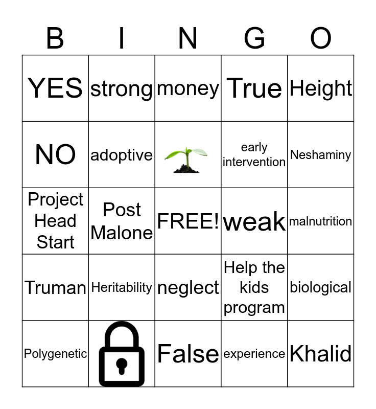 This bingo card has 2 images, a free space and 22 words: Heritability, Polygenetic, Height, YES, NO, strong, weak, neglect, early intervention, Project Head Start, Help the kids program, biological, adoptive, experience, malnutrition, money, Neshaminy, Post Malone, Khalid, Truman, True and False.