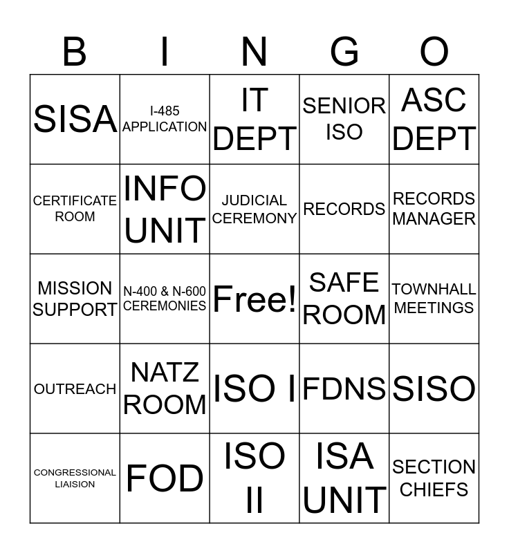 This bingo card has a free space and 25 words: NATZ ROOM, ISO II, JUDICIAL CEREMONY, CONGRESSIONAL LIAISION, ASC DEPT, SISA, CERTIFICATE ROOM, I-485 APPLICATION, SAFE ROOM, ISO I, RECORDS, MISSION SUPPORT, FDNS, SISO, INFO UNIT, N-400 APPLICATION, TOWNHALL MEETINGS, IT DEPT, RECORDS MANAGER, N-400 & N-600 CEREMONIES, SECTION CHIEFS, FOD, OUTREACH, SENIOR ISO and ISA UNIT.
