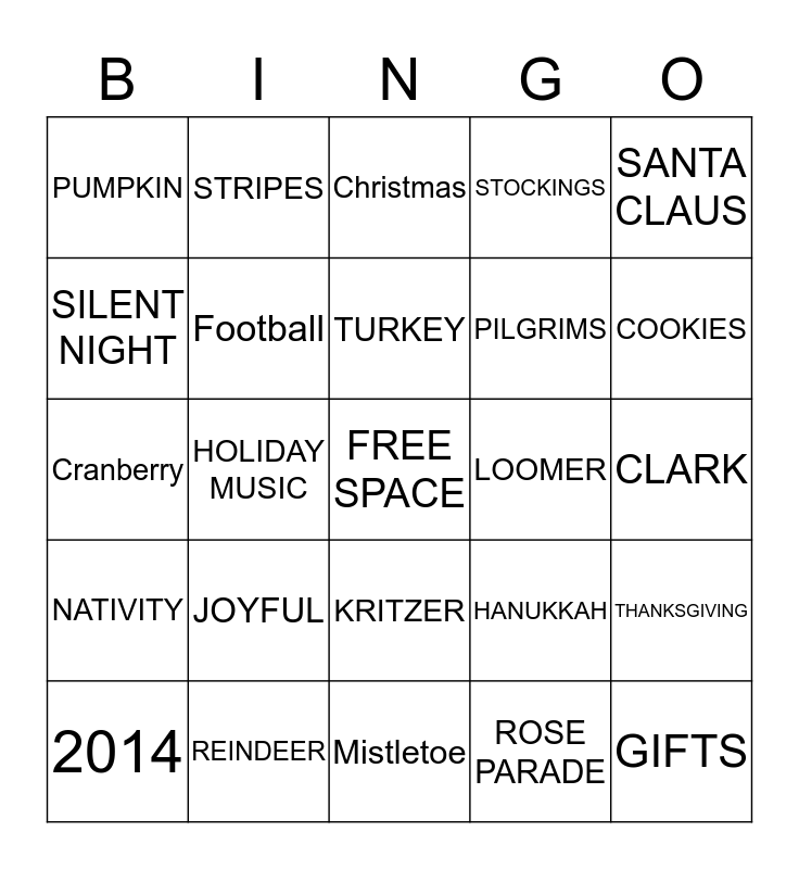 This bingo card has a free space and 29 words: 2014, Crumbley, HOLIDAY MUSIC, LEVINE, PUMPKIN, Christmas, Football, JOYFUL, LOOMER, REINDEER, CLARK, GIFTS, Mistletoe, ROSE PARADE, COOKIES, GOBBLE GOBBLE, KRITZER, NATIVITY, SANTA CLAUS, Cranberry, HANUKKAH, KWANZA, PILGRIMS, SILENT NIGHT, STOCKINGS, STRIPES, THANKSGIVING, TURKEY and WARNER.