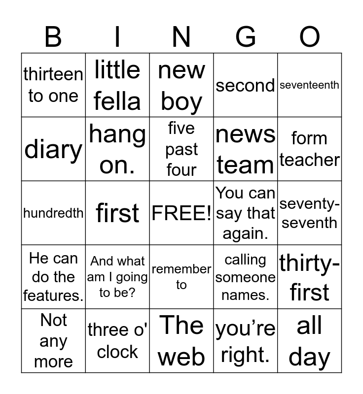 This bingo card has a free space and 31 words: The web, I can be there., first, she is bossy, thirteen to one, new boy, hang on., calling someone names., You can say that again., you’re right., seventy-seventh, all day, twenty past ten, take photographs, form teacher, You got it., thirty-first, And what am I going to be?, He can do the features., remember to, seventeenth, Mike’s on the sports page., Not any more, little fella, news team, diary, second, hundredth, three o' clock, five past four and posh school.