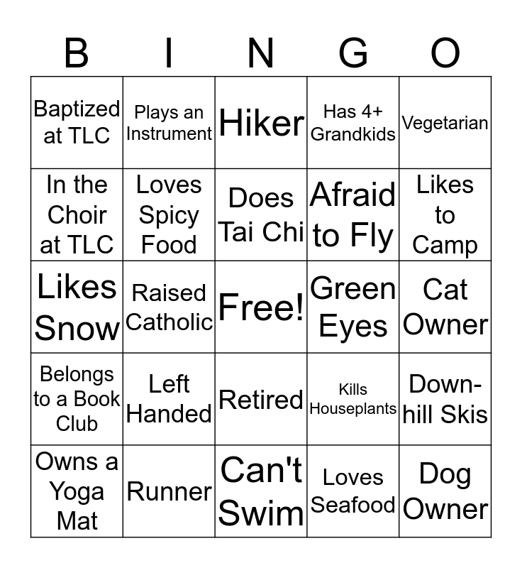 This bingo card has a free space and 29 words: Reads Cookbooks, Runner, Hiker, Confirmed at TLC, Vegetarian, Baptized at TLC, Loves Spicy Food, Does Tai Chi, Green Eyes, Down-hill Skis, Owns a Yoga Mat, Raised Catholic, Loves Seafood, Dog Owner, Likes Snow, Is a Twin, Can't Swim, Kills Houseplants, Likes to Camp, Belongs to a Book Club, Left Handed, Married at TLC, Afraid to Fly, Cat Owner, In the Choir at TLC, Plays an Instrument, Retired, Has 4+ Grandkids and Wearing Blue.