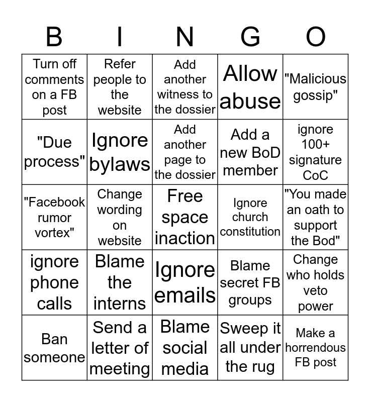 This bingo card has a free space and 24 words: Blame the interns, Send a letter of meeting, Add another page to the dossier, Ban someone, "Malicious gossip", Turn off comments on a FB post, "Due process", Refer people to the website, Ignore church constitution, Ignore emails, Add a new BoD member, "Facebook rumor vortex", Blame secret FB groups, Change who holds veto power, Ignore bylaws, Sweep it all under the rug, "You made an oath to support the Bod", Add another witness to the dossier, ignore 100+ signature CoC, Change wording on website, Make a horrendous FB post, ignore phone calls, Allow abuse and Blame social media.