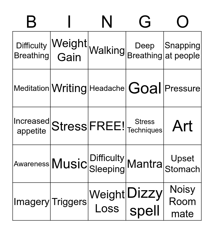 This bingo card has a free space and 24 words: Music, Triggers, Headache, Imagery, Snapping at people, Difficulty Breathing, Meditation, Weight Gain, Stress Techniques, Difficulty Sleeping, Goal, Increased appetite, Mantra, Upset Stomach, Writing, Dizzy spell, Art, Walking, Pressure, Stress, Noisy Room mate, Awareness, Deep Breathing and Weight Loss.