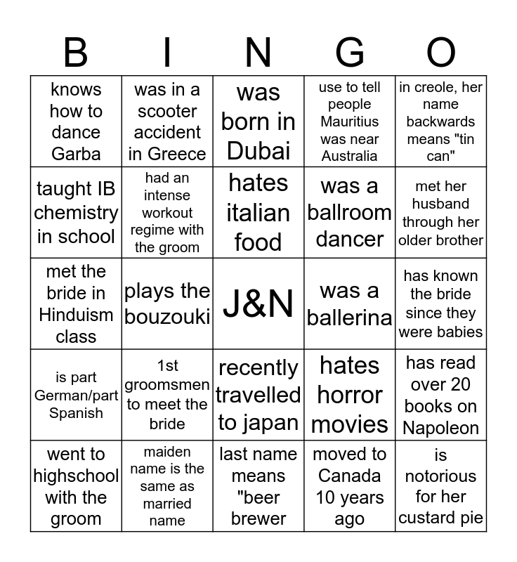 This bingo card has a free space and 24 words: 1st groomsmen to meet the bride, maiden name is the same as married name, hates italian food, went to highschool with the groom, in creole, her name backwards means "tin can", knows how to dance Garba, taught IB chemistry in school, was in a scooter accident in Greece, was a ballerina, recently travelled to japan, was a ballroom dancer, met the bride in Hinduism class, hates horror movies, has read over 20 books on Napoleon, had an intense workout regime with the groom, moved to Canada 10 years ago, has known the bride since they were babies, was born in Dubai, met her husband through her older brother, plays the bouzouki, is notorious for her custard pie, is part German/part Spanish, use to tell people Mauritius was near Australia and last name means "beer brewer.