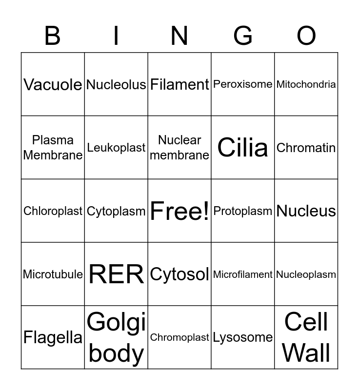 This bingo card has a free space and 29 words: Flagella, Nuclear pores, Cytoplasm, Cytoskeleton, Vacuole, Filament, Leukoplast, RER, Protoplasm, Golgi body, Nucleus, Cell Wall, Chromoplast, Lysosome, Chromatin, Centrioles, Cytosol, Microtubule, Mitochondria, Chloroplast, Microfilament, SER, Cilia, Plasma Membrane, Peroxisome, Nucleolus, Nucleoplasm, Nuclear membrane and Ribosomes.