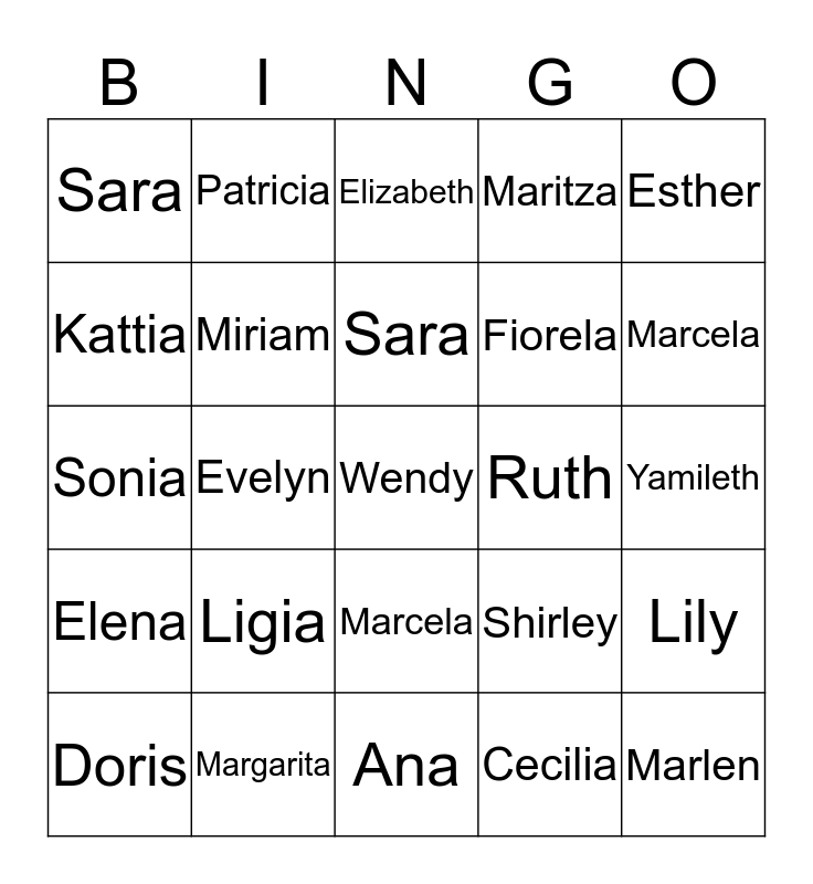 ⚠ This card has duplicate items: Adriana (2), Alejandra (2), Ana (2), Brenda (2), Cecilia (2), Cristina (2), Diana (2), Doris (2), Irlania (2), Irene (2), Hazel (2), Flor (2), Fiorela (2), Evelyn (2), Esther (2), Elizabeth (2), Jackeline (2), Jenifer (2), Jessica (2), Karolay (2), Katherin (2), Kattia (2), Kimberlin (2), Ligia (2), Miriam (2), Melissa (2), Marlen (2), Maritza (2), Maria (2), Margarita (2), Marcela (2), Lily (2), Nelly (2), Patricia (2), Priscilla (2), Roxana (2), Ruth (2), Sara (2), Shirley (2), Sonia (2), Elena (2), Yamileth (2), Wilma (2), Wendy (2), Vanessa (2), Susana (2)