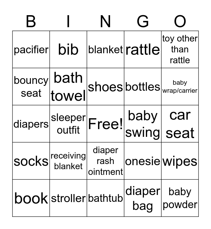 This bingo card has a free space and 24 words: receiving blanket, stroller, shoes, book, toy other than rattle, pacifier, bouncy seat, bib, baby swing, diaper rash ointment, bottles, diapers, onesie, wipes, bath towel, diaper bag, car seat, blanket, baby wrap/carrier, sleeper outfit, baby powder, socks, rattle and bathtub.