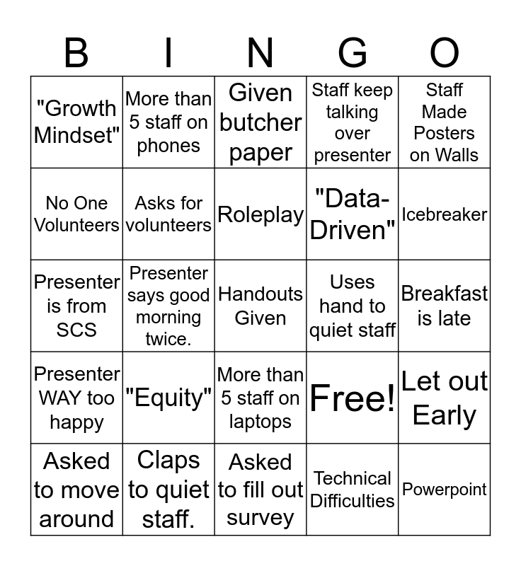 This bingo card has 25 words: "Equity", Asked to fill out survey, Roleplay, Asked to move around, Staff Made Posters on Walls, "Growth Mindset", No One Volunteers, More than 5 staff on phones, Uses hand to quiet staff, More than 5 staff on laptops, "Data-Driven", Presenter is from SCS, Free!, Let out Early, Asks for volunteers, Powerpoint, Breakfast is late, Given butcher paper, Icebreaker, Presenter says good morning twice., Handouts Given, Claps to quiet staff., Presenter WAY too happy, Staff keep talking over presenter and Technical Difficulties.