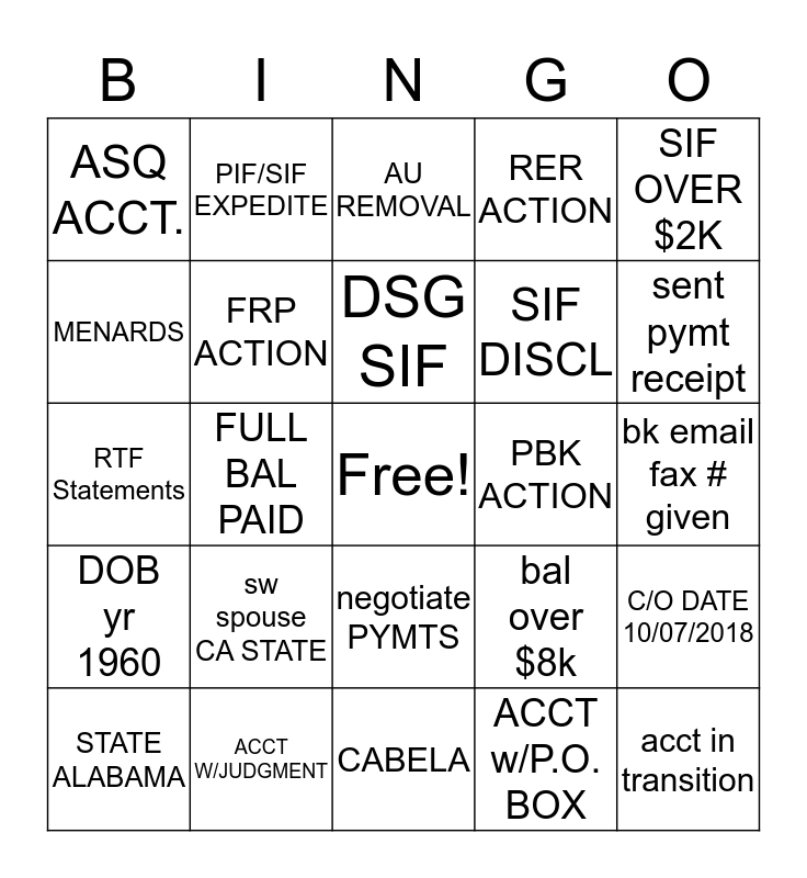 This bingo card has a free space and 24 words: sw spouse CA STATE, ACCT W/JUDGMENT, DSG SIF, STATE ALABAMA, SIF OVER $2K, ASQ ACCT., MENARDS, PIF/SIF EXPEDITE, PBK ACTION, negotiate PYMTS, SIF DISCL, RTF Statements, bal over $8k, C/O DATE 10/07/2018, FRP ACTION, ACCT w/P.O. BOX, bk email fax # given, AU REMOVAL, sent pymt receipt, FULL BAL PAID, acct in transition, DOB yr 1960, RER ACTION and CABELA.