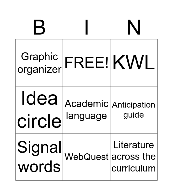 This bingo card has 9 words: Signal words, KWL, FREE!, Idea circle, Graphic organizer, Anticipation guide, Academic language, Literature across the curriculum and WebQuest.