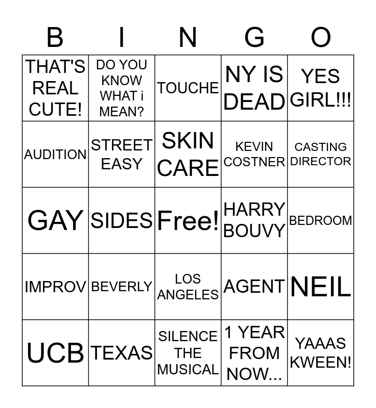 This bingo card has a free space and 24 words: BEVERLY, TEXAS, SKIN CARE, UCB, YES GIRL!!!, THAT'S REAL CUTE!, AUDITION, DO YOU KNOW WHAT i MEAN?, HARRY BOUVY, LOS ANGELES, KEVIN COSTNER, GAY, AGENT, NEIL, STREET EASY, 1 YEAR FROM NOW..., BEDROOM, TOUCHE, CASTING DIRECTOR, SIDES, YAAAS KWEEN!, IMPROV, NY IS DEAD and SILENCE THE MUSICAL.