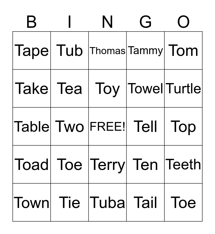 This bingo card has a free space and 24 words: Toe, Tie, Toy, Town, Tom, Tape, Take, Tub, Tell, Terry, Towel, Table, Ten, Teeth, Tea, Tail, Top, Thomas, Turtle, Two, Toe, Toad, Tammy and Tuba.