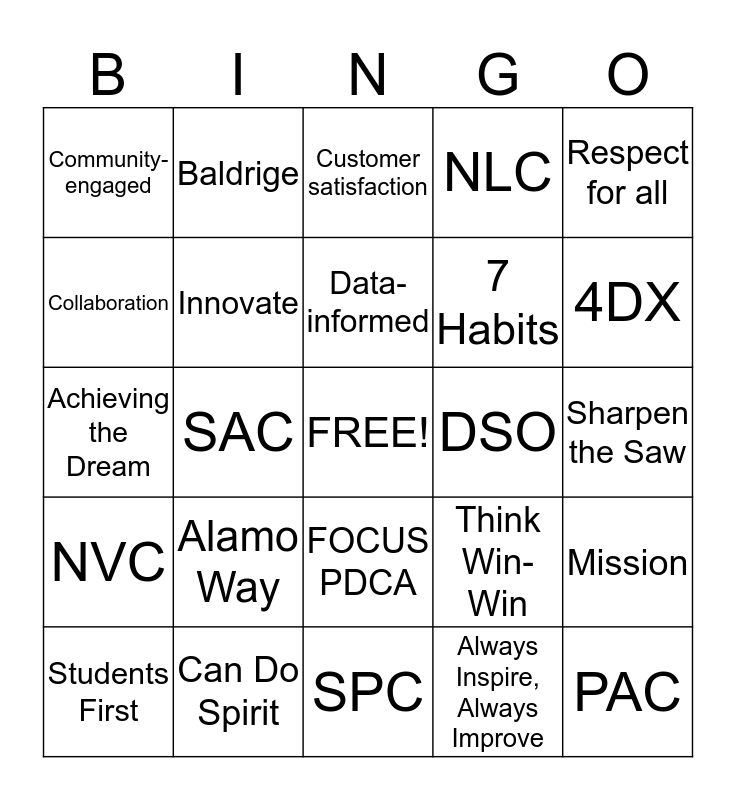 This bingo card has a free space and 24 words: Alamo Way, Can Do Spirit, Data-informed, Students First, Respect for all, Community-engaged, Collaboration, Baldrige, DSO, FOCUS PDCA, 7 Habits, Achieving the Dream, Think Win-Win, Mission, Innovate, Always Inspire, Always Improve, Sharpen the Saw, Customer satisfaction, 4DX, SAC, PAC, NVC, NLC and SPC.