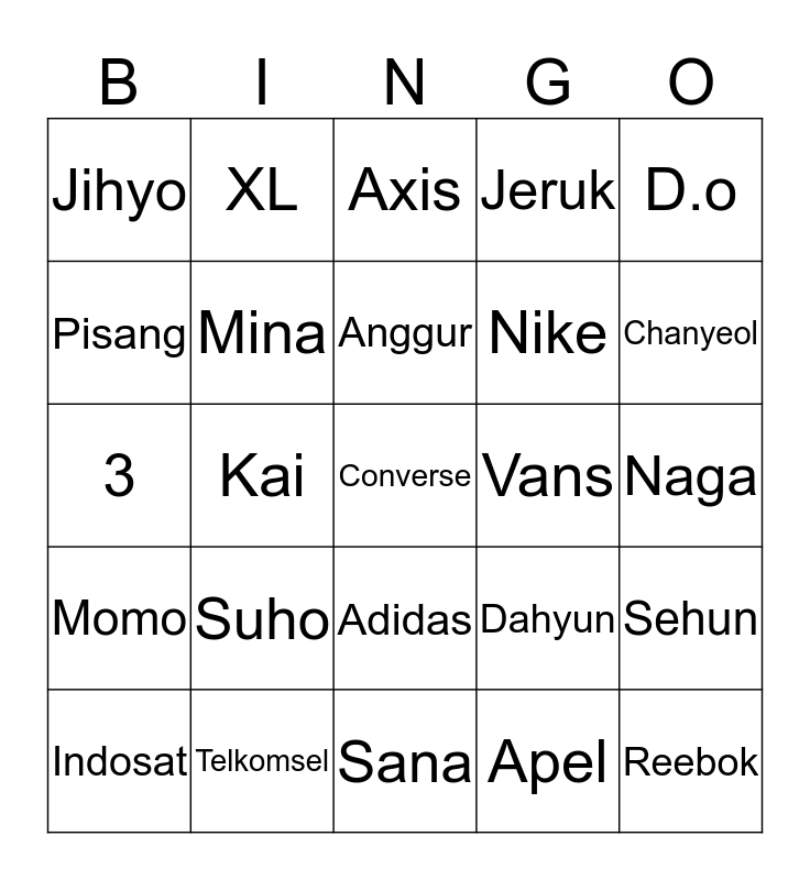 This bingo card has a free space and 24 words: Suho, Telkomsel, Anggur, Indosat, D.o, Jihyo, Pisang, XL, Vans, Adidas, Nike, 3, Dahyun, Sehun, Mina, Apel, Naga, Axis, Chanyeol, Kai, Reebok, Momo, Jeruk and Sana.